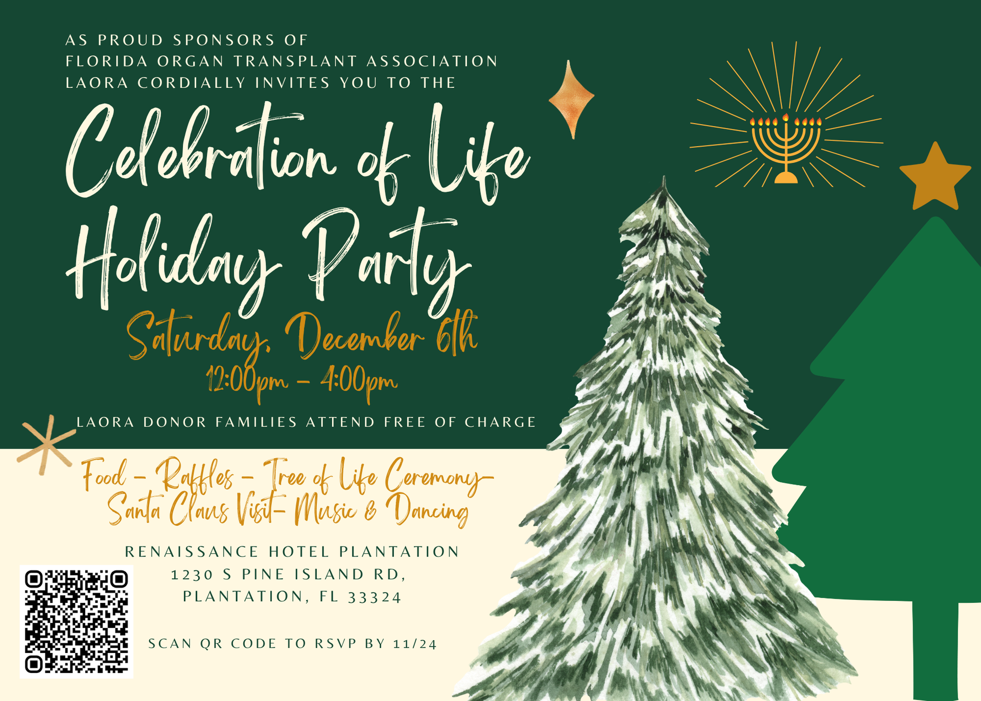 As Florida Organ Transplant Association sponsors, we are delighted to welcome you and your loved ones to this special event. To ensure we can accommodate as many families as possible, we kindly ask that each family limit their RSVP to 5 guests. To learn more about FOTA and the amazing work they do out in the community for the donation and transplantation community, visit their site https://www.floridaorgantransplant.org/