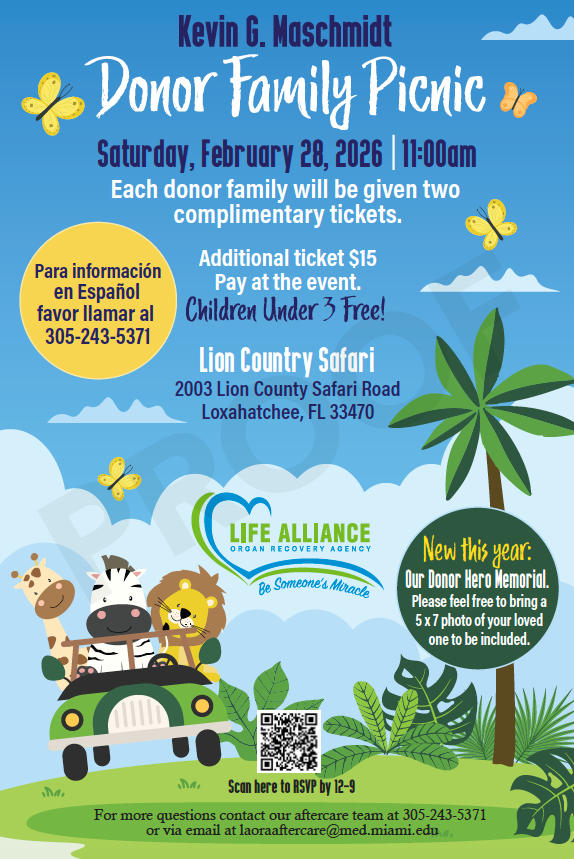 At this time, we are no longer accepting RSVPs for the Annual Donor Family Picnic. If you have any questions or need assistance, please feel free to contact our Aftercare Team at laoraaftercare@med.miami.edu or call 305-243-5371.